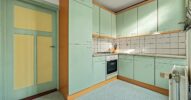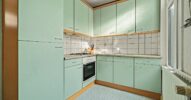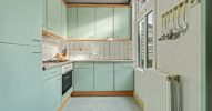Aansluitend bevindt zich de keuken, uitgevoerd in een lichte kleurstelling en voorzien van een gaskookplaat, oven en spoelbak. De keuken biedt directe toegang tot de achtergelegen bijkeuken.