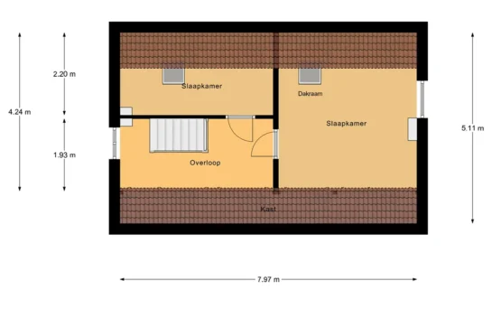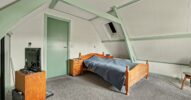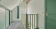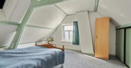 Via de trap bereikt u de eerste verdieping. Hier bevinden zich twee slaapkamers, beide voorzien van een karakteristieke kapconstructie en een fijne lichtinval. De kamers zijn praktisch ingedeeld en bieden voldoende ruimte voor comfortabel gebruik als slaapkamer, werkkamer of hobbyruimte. Op de overloop is extra bergruimte aanwezig.