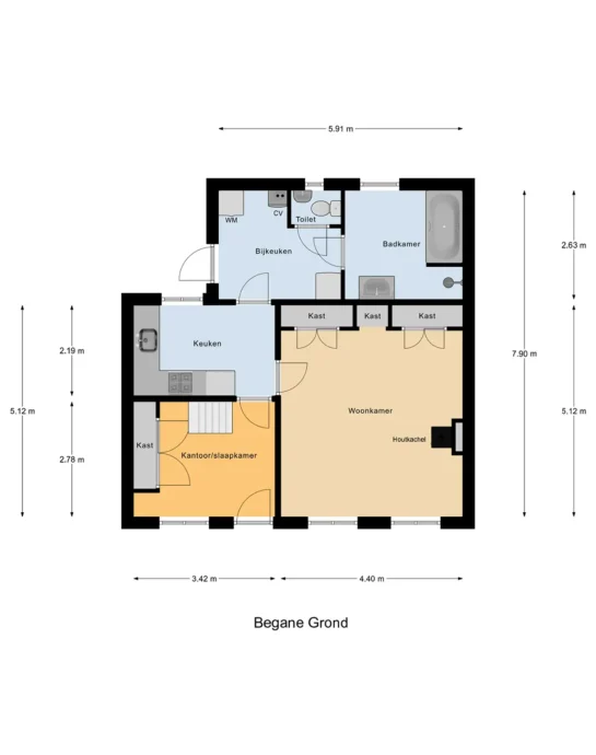 U betreedt de woning via de entree aan de achterzijde, waar u binnenkomt in de bijkeuken met toegang tot de verschillende vertrekken. Vanuit hier bereikt u de woonkamer, die zich kenmerkt door een prettige lichtinval dankzij de meerdere ramen aan de voorzijde. De ruimte heeft een sfeervolle uitstraling en biedt voldoende mogelijkheden om deze naar eigen wens in te richten. De opstelplaats voor een houtkachel vormt een centraal element in de ruimte, waar u tijdens de koudere dagen optimaal van kunt genieten.