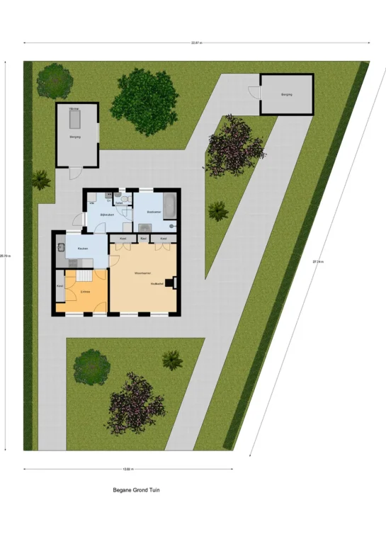 De woning is gelegen op een ruim perceel met een diepe tuin rondom. De tuin biedt volop mogelijkheden om verschillende zitplekken te creëren en te genieten van het vrije uitzicht over de omliggende landerijen. Achter in de tuin bevindt zich een vrijstaande berging met een vliering, ideaal voor opslag of het uitoefenen van hobby’s. Daarnaast is er voldoende ruimte voor het aanleggen van een moestuin of het houden van dieren.