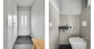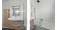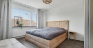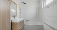 De badkamer is verzorgd en compleet ingericht met een ligbad en een wastafelmeubel. Verder vindt u op deze verdieping een separate toilet, net uitgevoerd met tegelwerk. De lichte wandtegels van beide ruimtes in combinatie met de donkere vloer zorgen voor een frisse en moderne uitstraling.