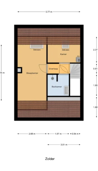 De tweede verdieping is bereikbaar via een vaste trap en biedt een ruime zolderverdieping. Hier bevinden zich twee extra slaapkamers, die uitstekend gebruikt kunnen worden als slaapkamer, werkruimte of hobbykamer. Daarnaast is er ruimte voor de opstelling van de cv-installatie en extra bergruimte. Dankzij de dakramen is er voldoende daglicht aanwezig.