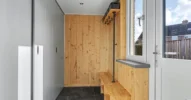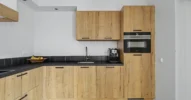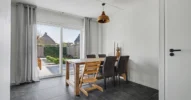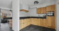 Aan de achterzijde van de woning bevindt zich de keuken, uitgevoerd in een praktische L-opstelling. De keuken heeft een moderne uitstraling met houtlook kastfronten en een donker werkblad en is uitgerust met diverse inbouwapparatuur, waaronder een inductiekookplaat, afzuigkap, combi-oven, vaatwasser en een koelkast. Dankzij de ruime opzet is er volop werk- en bergruimte aanwezig, wat de keuken zowel functioneel als stijlvol maakt. Vanuit de keuken heeft u toegang tot de bijkeuken. Hier bevinden zich de aansluitingen voor de wasmachine en droger en is er extra bergruimte aanwezig ook is er een directe toegang tot de achtertuin.