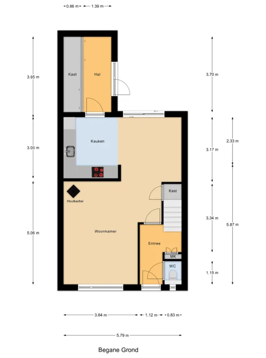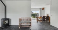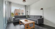 Via de entree komt u binnen in de hal met meterkast, toilet en trapopgang. Vanuit hier betreedt u de woonkamer, die direct opvalt door de lichte en open uitstraling. De grote raampartijen zorgen voor een prettige lichtinval en bieden zicht op de straatzijde. De ruimte is afgewerkt met een moderne, donkere tegelvloer en biedt voldoende plaats voor een comfortabele zithoek.