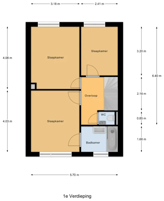 Op de eerste verdieping bevinden zich drie slaapkamers, allen van goed formaat en voorzien van een nette afwerking en prettige lichtinval. De kamers zijn flexibel in te richten als slaap-, werk- of hobbyruimte. Alle kamers zijn afgewerkt met een laminaatvloer, wat zorgt voor een warme en uniforme uitstraling.